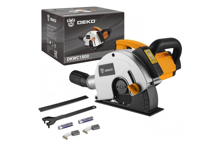Штроборез DEKO DKWC1800 — инструмент для создания штроб. Мощность мотора — 1,8 кВт, работает со 125-мм кругами. Максимальная глубина резания — 28 мм, ширина штробы — до 29 мм. Есть плавный пуск и «лазерный прицел» (но его эффективность сомнительна, так как при работе лазер светит в обратную сторону). Мотор расположен сбоку, без углового редуктора, что может затруднять разметку.