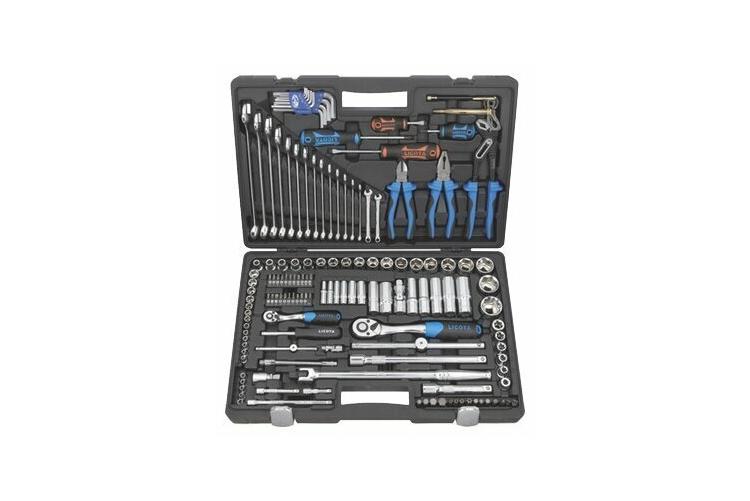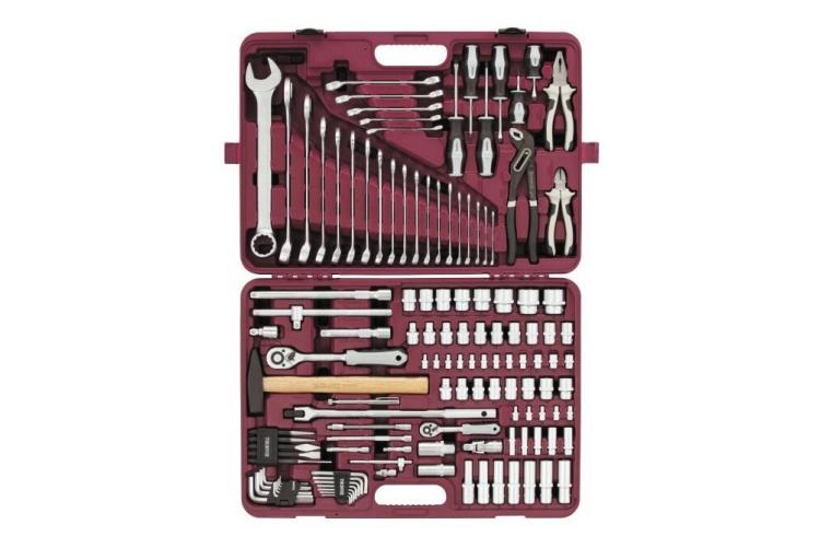 Автомобильный набор инструментов предлагает сбалансированное соотношение «цена — качество». В комплекте: две трещотки, головки ходовых размеров, биты (в том числе под шестигранники большого размера), удлинители, срывник и рожково-накидные ключи. Инструмент частично хромирован — хром нанесён на ключи и часть поверхностей головок большого размера. Среди недостатков — недостаточно надёжная фиксация головок в чемоданчике и пластиковые застёжки вместо металлических.