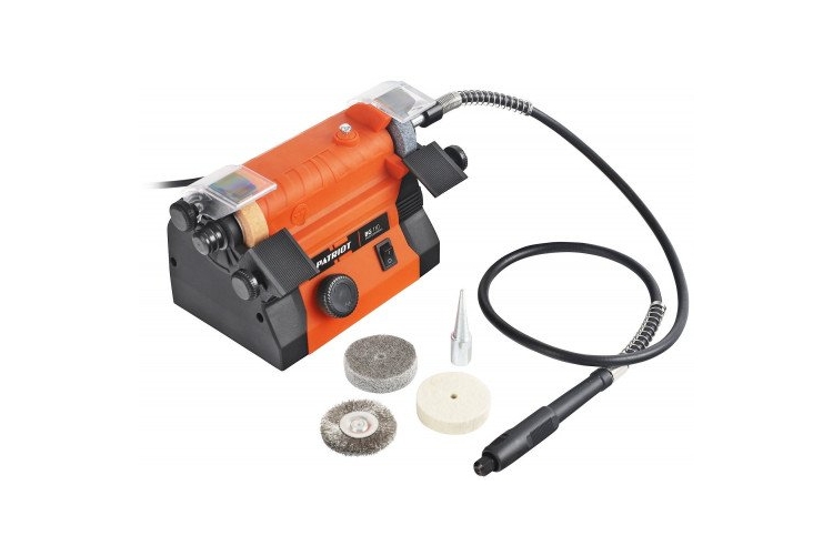 Точильный станок «Мастер на все руки» от Patriot — универсальный инструмент для лёгких и точных работ. Оснащён двумя полировальными кругами (шерстяным и нейлоновым) с посадкой 12,7 мм, позволяет использовать алмазные круги, щётки и другую оснастку. Мощность коллекторного двигателя — 100 Вт, обороты — 9000 об/мин, есть регулятор оборотов (от 3000 об/мин). В комплекте граверная насадка на гибком рукаве (1 м) и сужающаяся шарошка. Есть пылесборник.