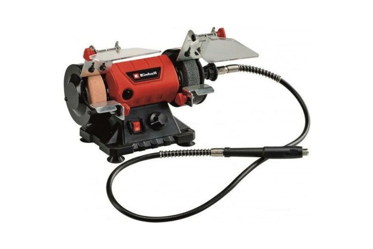 Точильный станок Einhell TC-XG 75 Kit — мощный инструмент с двигателем 120 Вт и оборотами до 9900 об/мин. Имеет круги диаметром 75 мм, посадку кругов и гибкого вала по 10 мм. В комплекте деревянный ящичек с насадками для гравера. Есть регулятор оборотов, удобный для работы «вслепую». Учтите, что мотор греется и требует перерывов в работе.