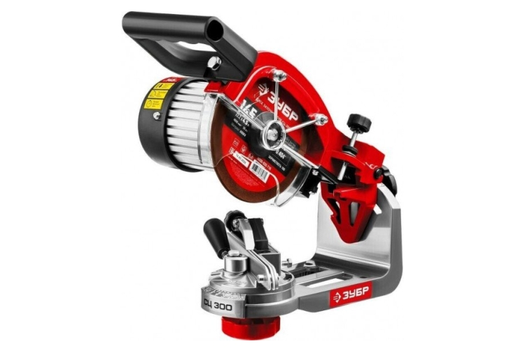 Зубр СЦ-300 — станок для заточки цепей с асинхронным двигателем, работает тихо и не требует замены щёток. Мощность — 230 Вт, обороты холостого хода — 3000 об/мин. Использует круги диаметром 145 мм с посадкой 22 мм. В комплекте два круга для цепей толщиной 3,2 и 4,5 мм (зернистость — 100), торцовый ключ. Есть светодиодная подсветка, станина крепится к столу. Зажим цепи осуществляется рычагом.