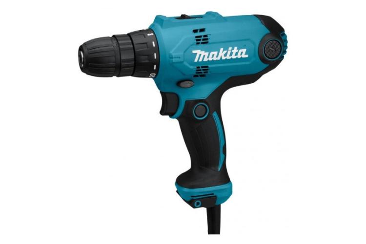 Сетевой шуруповёрт Makita DF0300 — неплохой вариант, несмотря на то что сетевые модели менее удобны, чем аккумуляторные. Лёгкий (1,2 кг) и мощный (320 Вт), развивает крутящий момент до 56 Н·м. У него две скорости: 450 и 1500 об/мин, регулировка крутящего момента — через муфту с 20 положениями. Рукоять обрезиненная, удобная, но при долгой работе может чувствоваться небольшой дисбаланс. Патрон быстрозажимной, но есть нарекания на его раскручивание при работе.