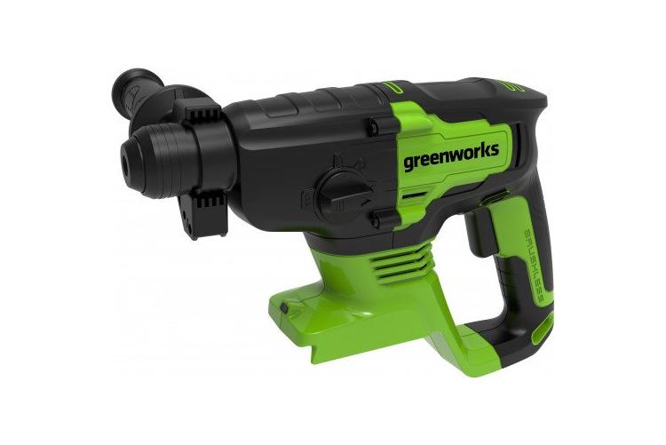Перфоратор Greenworks из любительской серии работает с 24-вольтовыми аккумуляторами. Энергия удара — 1,2 Дж, вес без аккумулятора — всего 1,25 кг. Оснащён бесщёточным двигателем DigiPro, имеет пластиковый корпус редуктора и металлическую «начинку». Удобно лежит в руке благодаря обрезиненной рукояти, можно использовать угловую распорку. Подойдёт для домашних работ как лёгкая дрель с возможностью работы с бурами, создаёт меньше вибраций и шума по сравнению с ударной дрелью.