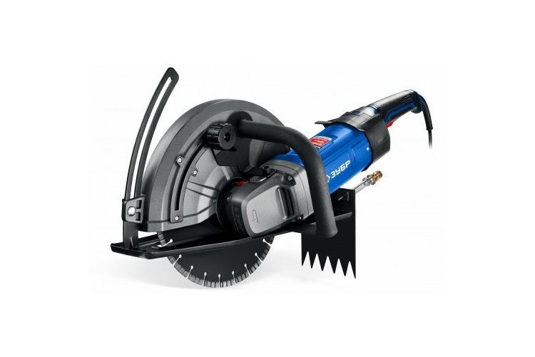 Штроборез/бетонорез «Зубр» — универсальный инструмент для «мокрой» резки бетона и штробления. Мощность двигателя — 2,7 кВт, есть плавный пуск, защита от повторного пуска и перегрузки, система поддержания оборотов. Работает с кругами 355 мм, максимальная глубина резания — 125 мм. Кожух из магниевого сплава можно откинуть назад или закрепить на инструменте. Есть защита от брызг, УЗО на кабеле, а для работы «на сухую» предусмотрен патрубок для подключения пылесоса.