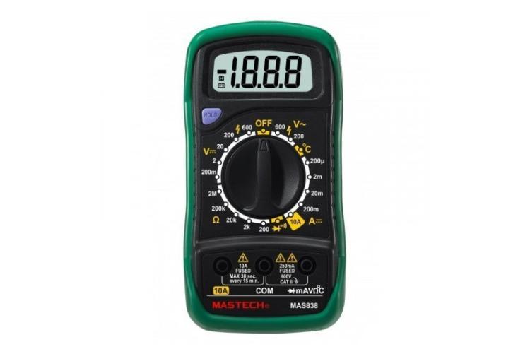 Мультиметр Mastech MAS-838 — обновлённая версия легендарного M-838. Имеет обтекаемый корпус с защитным чехлом-подставкой, горизонтальным рядом гнёзд под щупы и кнопкой Hold для фиксации показаний. Панелька для измерения коэффициента усиления биполярных транзисторов стала линейной. Удобный инструмент для работы с электрикой и электроникой, прощает небольшие ошибки пользователя.