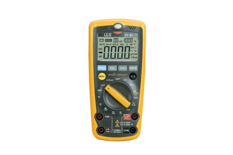 Мультиметр DT-61 — настоящая минилаборатория для изучения окружающей среды. Может измерять температуру бесконтактно (до высоких значений), влажность, освещённость и уровень шума. Есть режим удержания данных, автовыбор диапазона, подсветка дисплея и автовыключение. Подходит для проверок помещений на соответствие нормам охраны труда, соответствует требованиям электробезопасности.