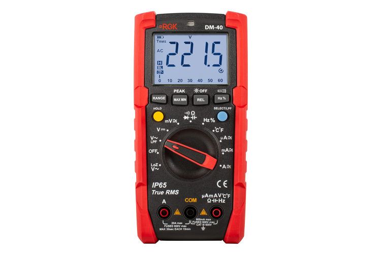 Мультиметр RGK — удобный инструмент с авторежимом и возможностью ручной фиксации диапазона. Есть полезные режимы: MAX/MIN, относительных измерений, фильтр низких частот, измерение напряжения в режиме LoZ. Погрешность измерения ёмкости и частоты низкая, минимальный диапазон измерения ёмкости — 6 нФ. Корпус защищён по стандарту IP65 и выдерживает падение с высоты до двух метров. В комплекте есть термопара (но она подходит только для температур до 100 °C) и датчик освещённости.