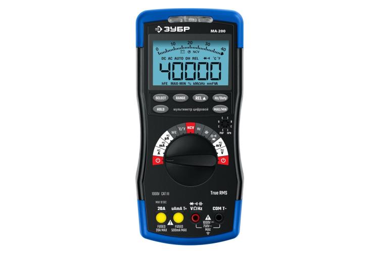 Мультиметр Зубр МА-200 — топовый в своей линейке. Имеет дисплей на 40 000 отсчётов, может измерять частоту до 10 МГц и вычислять True RMS. Есть режимы измерения напряжения и тока с возможностью переключения диапазонов, функции прозвонки, измерения сопротивления и проверки диодов. Среди других особенностей — индикация максимальных и минимальных значений, режим относительных измерений и встроенный датчик напряжения с двумя режимами индикации. Работает от 9-вольтовой батарейки.