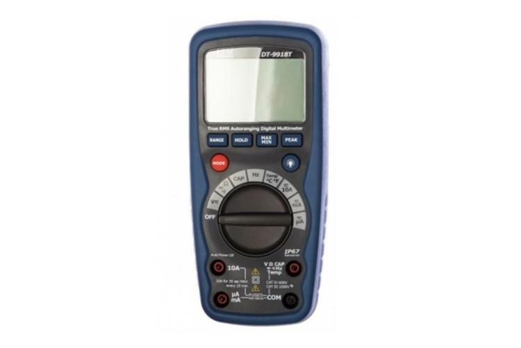 Мультиметр CEM DT-9918T — прибор с защитой IP67 и сертификацией Госреестра. Имеет селектор с углом поворота 180 градусов, поддерживает измерение в режиме True RMS, оснащён дисплеем с барграфом и цифровой частью на 4000 отсчётов. Может измерять ёмкость, частоту (до 10 МГц) и температуру. Есть функции удержания значения, индикации максимального/минимального/пикового значения, подсветки.