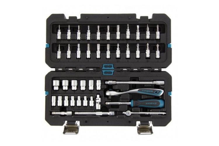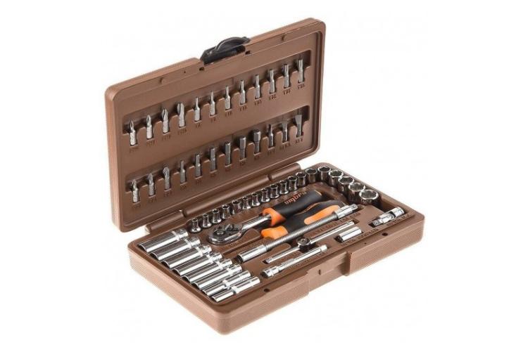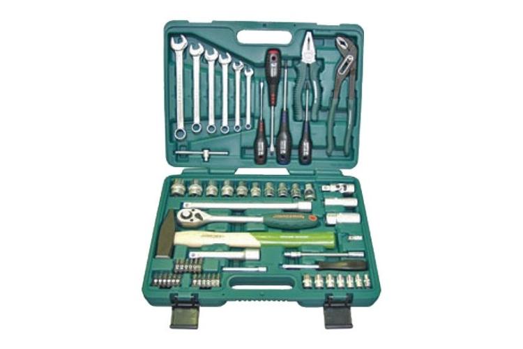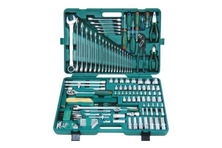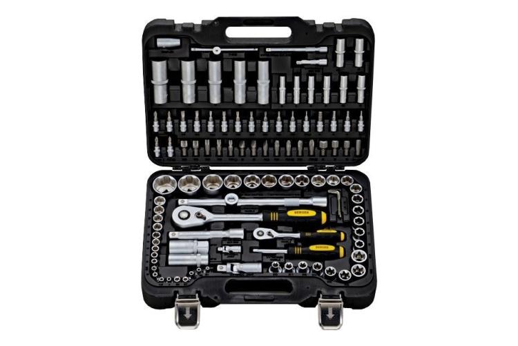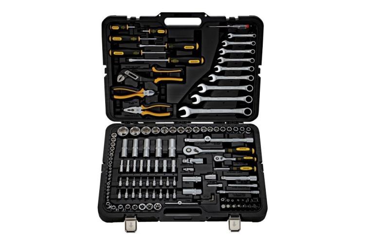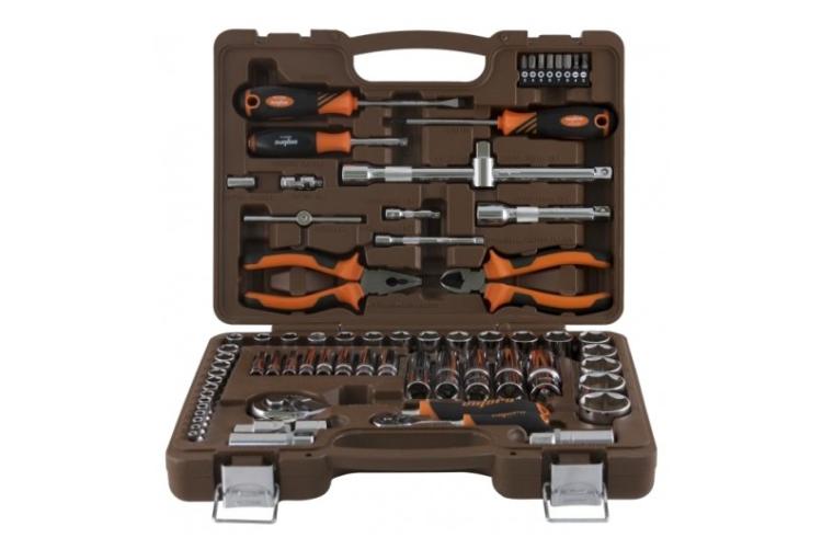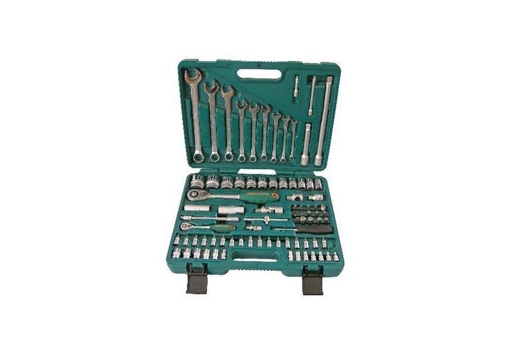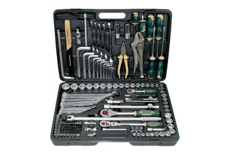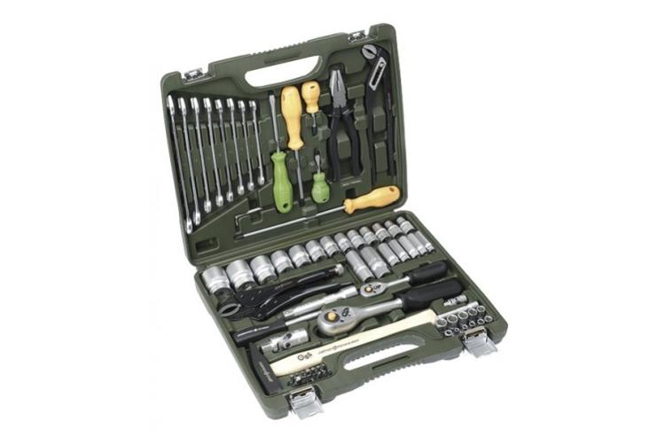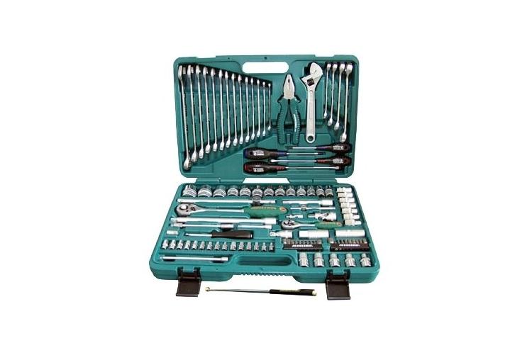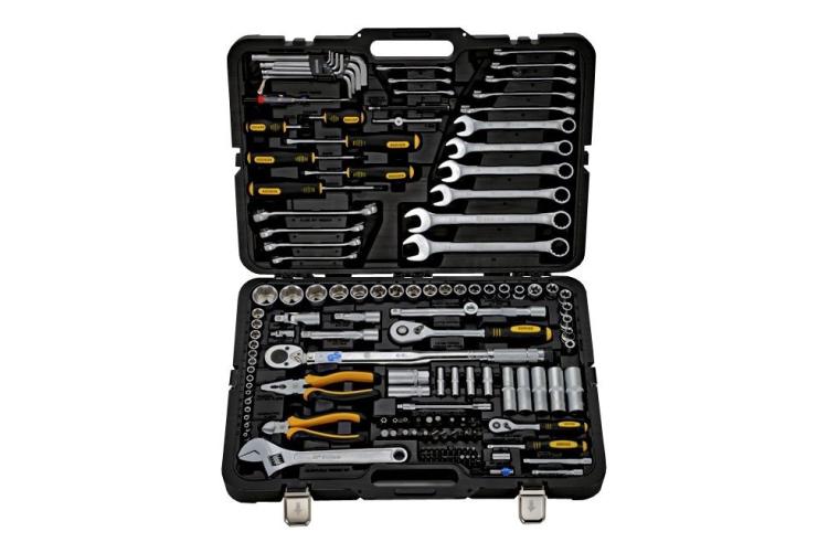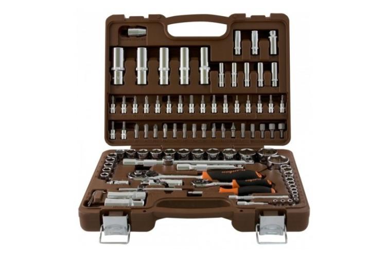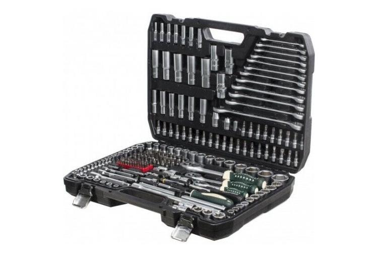 Автомобильный набор инструментов предлагает сбалансированное соотношение «цена — качество». В комплекте: две трещотки, головки ходовых размеров, биты (в том числе под шестигранники большого размера), удлинители, срывник и рожково-накидные ключи. Инструмент частично хромирован — хром нанесён на ключи и часть поверхностей головок большого размера. Среди недостатков — недостаточно надёжная фиксация головок в чемоданчике и пластиковые застёжки вместо металлических.