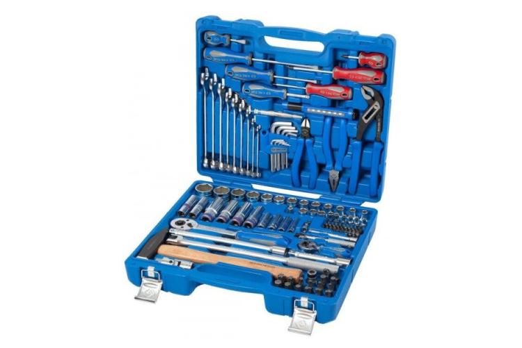 Чемоданчик синего цвета вмещает 110 предметов и включает разные инструменты. В наборе головки под полдюймовый и четвертьдюймовый квадрат, трещотки (на 32 и 72 зуба), удлинители, воротки, карданы, свечные головки (14 и 16 мм). Есть биты (SL, PH, PZ, Torx, H), комбинированные ключи (8–19 мм), отвёртки (6 шт.), плоскогубцы, бокорезы, переставные клещи, молоток (500 г) и дополнительные аксессуары — фонарик и пробник напряжения. Учтите, что пластик чемоданчика может давать вмятины и не всегда надёжно держит инструменты.