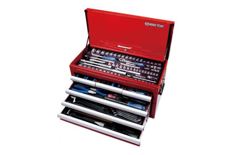 KING TONY 911-000CR — это универсальный набор автомобильного инструмента весом 25 кг, который размещается в вместительном ящике размером 660x307x374 мм. В наборе 219 предметов, включая головки, трещотки, 10 отвёрток, ключи (метрические и дюймовые), съёмники для стопорных колец, выколотки, зубила, молоток и ножовку по металлу. Есть шесть выдвижных ложементов и дополнительный отсек под верхней крышкой — их можно заменять, адаптируя набор под свои нужды.