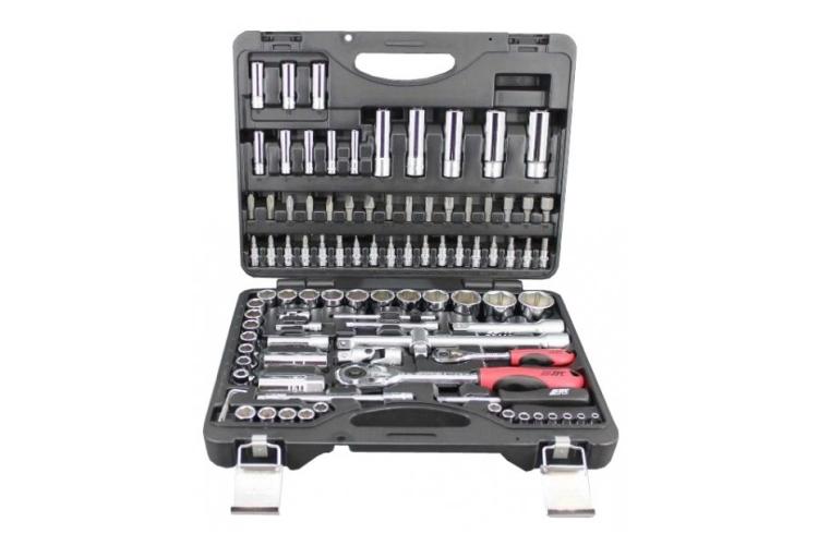 Набор инструментов JTC H096B — хороший выбор для гаража или автомастерской. В комплекте торцевые головки от 4 до 32 мм со скруглённым шестигранником, различные биты, удлинённые головки, набор трещоток (основная — под квадрат 1/2 дюйма, вспомогательная — кистевая 1/4 дюйма), отвёртка с гнездом под биты и головки 1/4 дюйма. Есть удлинитель на полдюйма, который можно использовать как срывник.