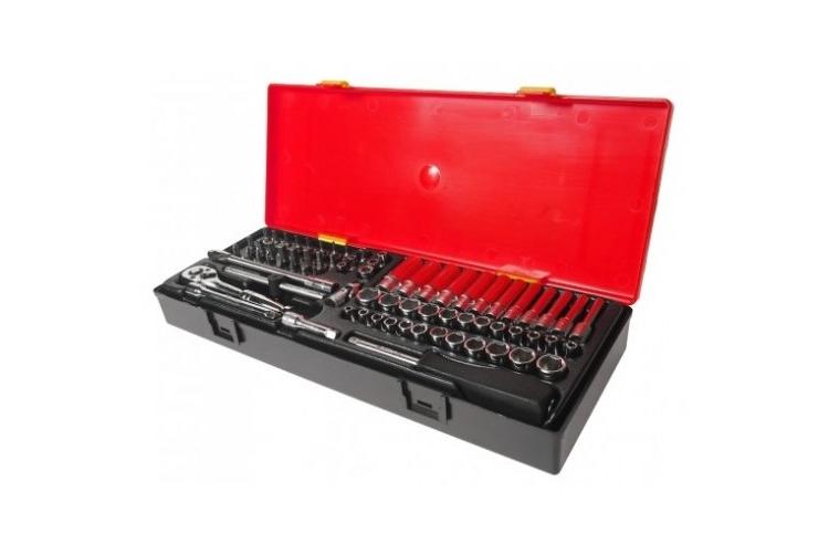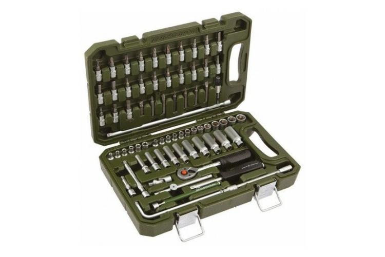 Набор инструментов — удобное решение для багажника автомобиля. Включает торцевые головки от 4 до 32 мм (есть глубокие под четверть и половину дюйма), кусачки для работы с проводкой и ещё 69 предметов. Прочные головки и трещотки хорошо справляются с работой, но есть недостатки: мало битов (только под переходник на ¼ дюйма), нет торксов, всего четыре шестигранных биты. Ещё проблема — переходник для бит, которые со временем могут начать выпадать.