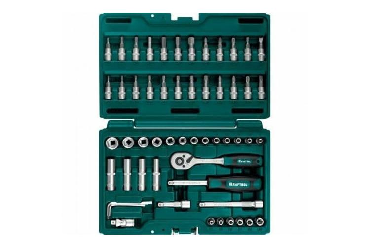 Kraftool X-drive 27885-H57 — набор инструментов из 57 предметов. В комплекте трещотка на 72 зуба, отвёртка, два удлинителя, карданчик. Есть короткие (4–14 мм) и удлинённые (6, 7, 8, 10 мм) шестигранные головки, 6 головок «типа Е» (от Е4 до Е10), набор бит: «кресты», плоские с тремя вариантами жала, «торксы», шестигранники. Всё хранится в прочном пластиковом кейсе с металлической застёжкой, позиции подписаны для удобства.