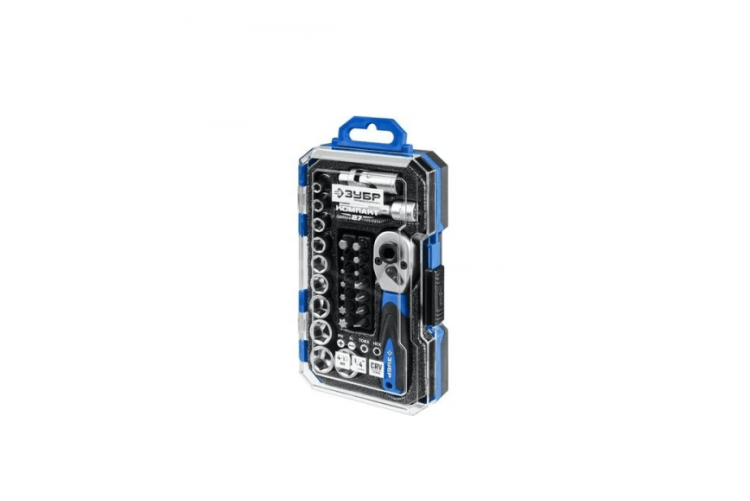 Набор инструментов включает трещотку со 120 зубьями, отвертку, вороток, два жёстких и один гибкий удлинитель, карданчик и 13 коротких головок (от 4 до 14 мм) из хромованадиевой стали. Биты (наиболее ходовые «кресты» PH и PZ, плоские, шестигранники и «торксы») сделаны из стали S2. Подходит для лёгких работ, но не рассчитан на серьёзные нагрузки.