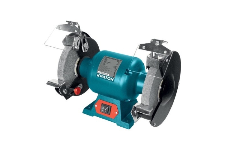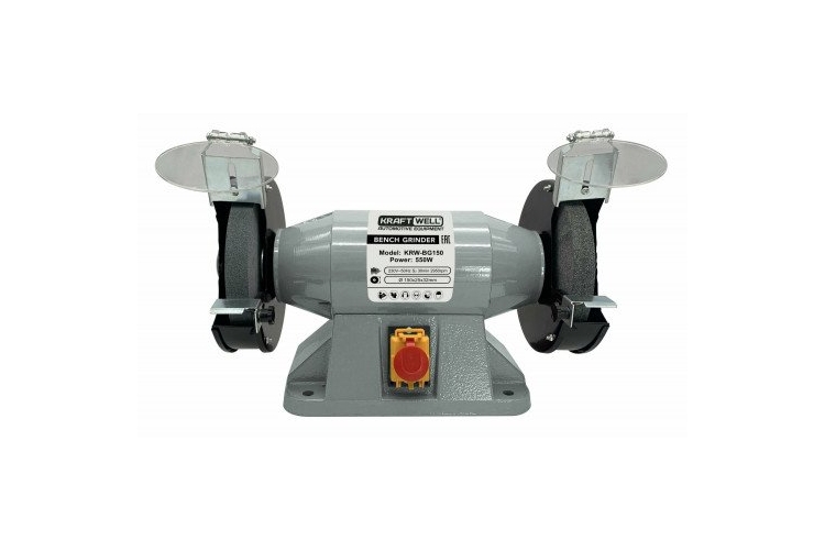 KraftWell KRW-BG150 — универсальный точильный станок с мотором 550 Вт и скоростью 2950 об/мин. Работает с кругами диаметром 150 мм, установлен на станине с четырьмя точками крепления, весит 13 кг. В комплекте втулки для кругов с посадкой 32 мм. Нет ванночки под воду и подсветки, подручники и крепления щитков могли бы быть лучше.