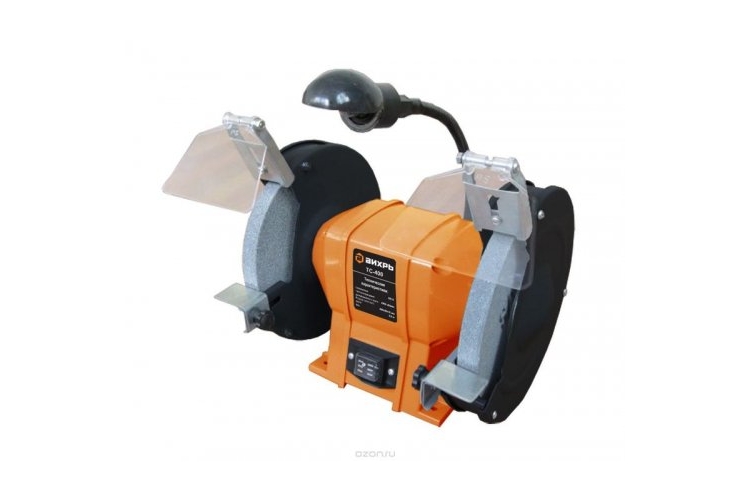 Точильный станок «Вихрь» — универсальный инструмент с мощностью 400 Вт и 200-миллиметровыми кругами (посадка 16 мм). Весит 9,2 кг, работает без перегрева, можно использовать около получаса с коротким перерывом. Есть подсветка — в некоторых комплектациях обычная лампа накаливания, в других — светодиоды (второй вариант предпочтительнее).