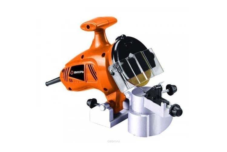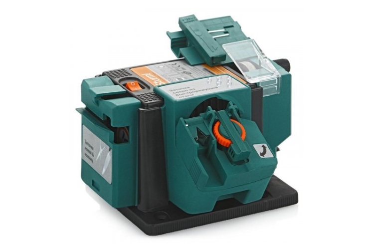 Станок мощностью 90 Вт подходит для домашнего использования — с его помощью можно время от времени затачивать цепи. Использует круги диаметром 104 мм с посадкой 22 мм; в комплекте два круга одинаковой зернистости (100) но разной толщины. Можно регулировать поворот стола (в пределах 35 градусов от «нулевого» положения в обе стороны), наклон головы фиксированный — 55 градусов. Есть светодиодная подсветка, но она не особо полезная.