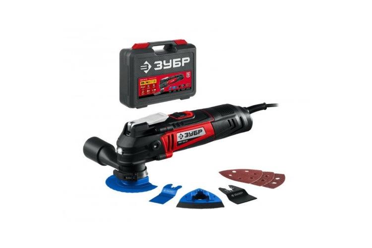 Реноватор «Зубр» — популярная недорогая модель с 500-ваттным мотором и поддержанием оборотов. Есть патрубок для подключения пылесоса (выходит набок), гнёзда под боковую ручку (но сама ручка в комплект не входит) и быстросъёмное крепление OIS/OQIS. Частота колебаний регулируется от 7000 до 19000 в минуту, рабочий угол — 3,2 градуса. Среди недостатков — проблемы с качеством сборки и ограниченное количество штырей для передачи усилия (6 вместо 12).